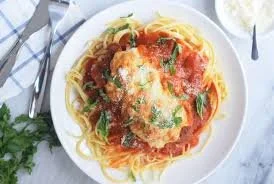 lightly breaded and topped with marinara sauce and mozzarella cheese served over spaghettini pasta